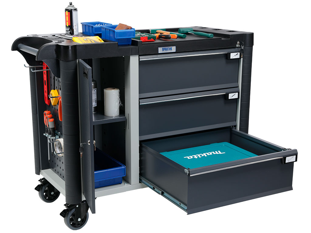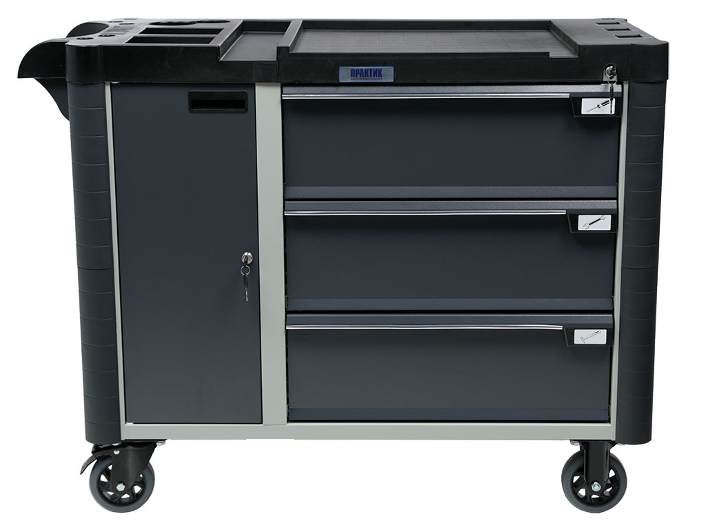 - Топ (пластик черного цвета) оснащён ложементами под инструменты для организации, хранения и удобства использования во время выполнения работ. Нагрузка на ТОП – 40 кг