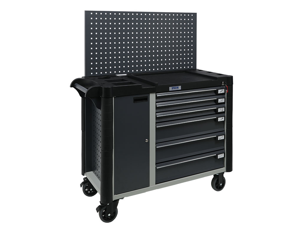 - Топ (пластик черного цвета) оснащён ложементами под инструменты для организации, хранения и удобства использования во время выполнения работ. Нагрузка на ТОП – 40 кг