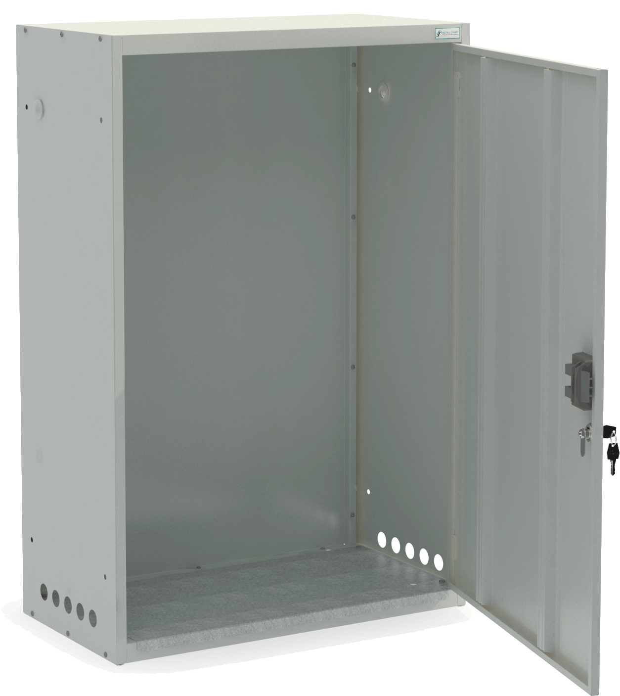 Шкафы серии ШГР изготавливаются из высококачественной конструкционной холоднокатаной стали. Металлический шкаф состоит из сборно-разборного корпуса и одной распашной двери. Корпус состоит из основания, усиленного оцинкованным настилом, крыши, двух боковых стенок и одной задней стенки. Сборка корпуса осуществляется на винтах и саморезах. Дополнительную жесткость основанию придает приварное ребро жесткости.